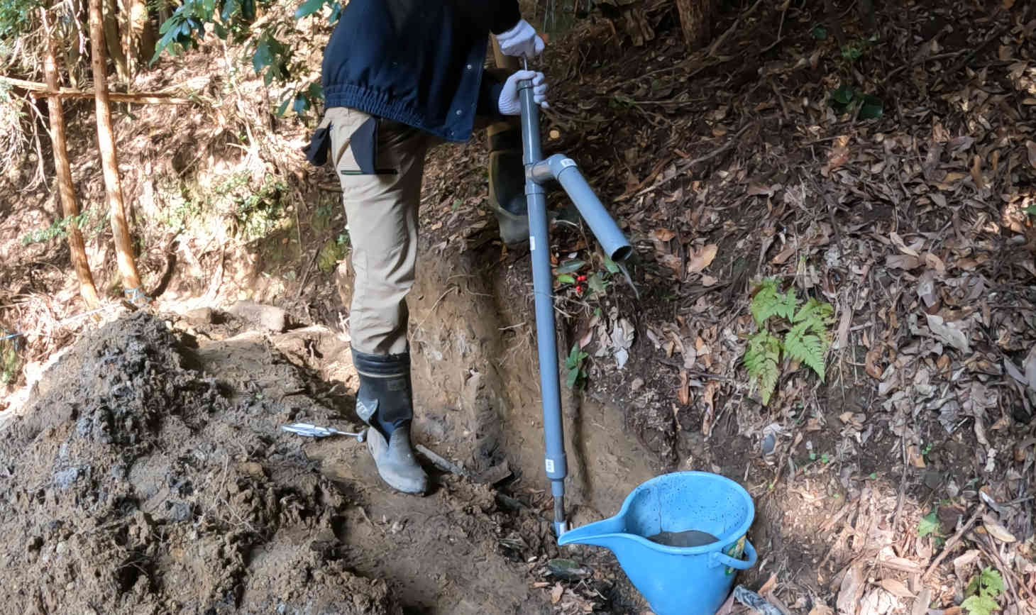 裏庭から発掘した塩ビパイプが水脈につながっているか確認する ②汲み上げ実験
