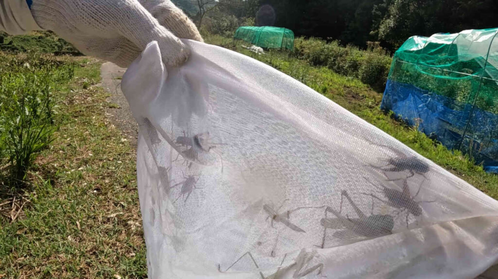 バッタとコオロギをメインに、小さい幼虫はスルーして大きめの成虫に狙いを定めて採集していきます。