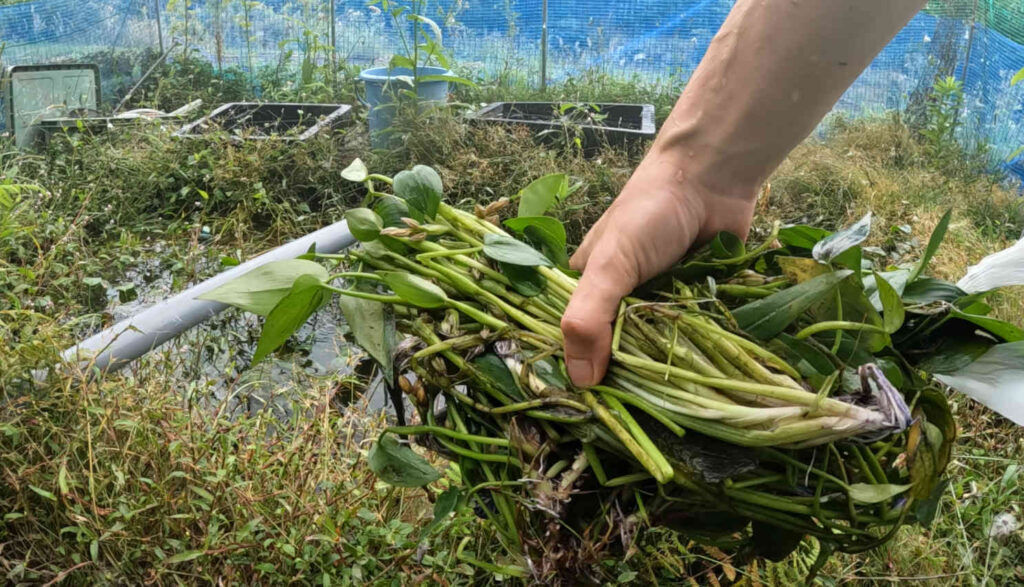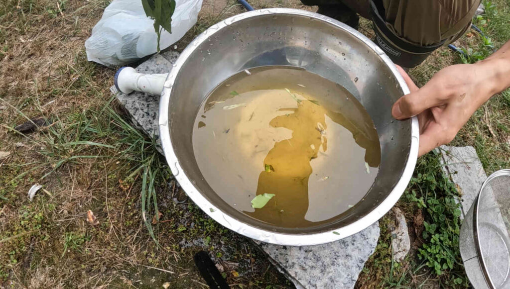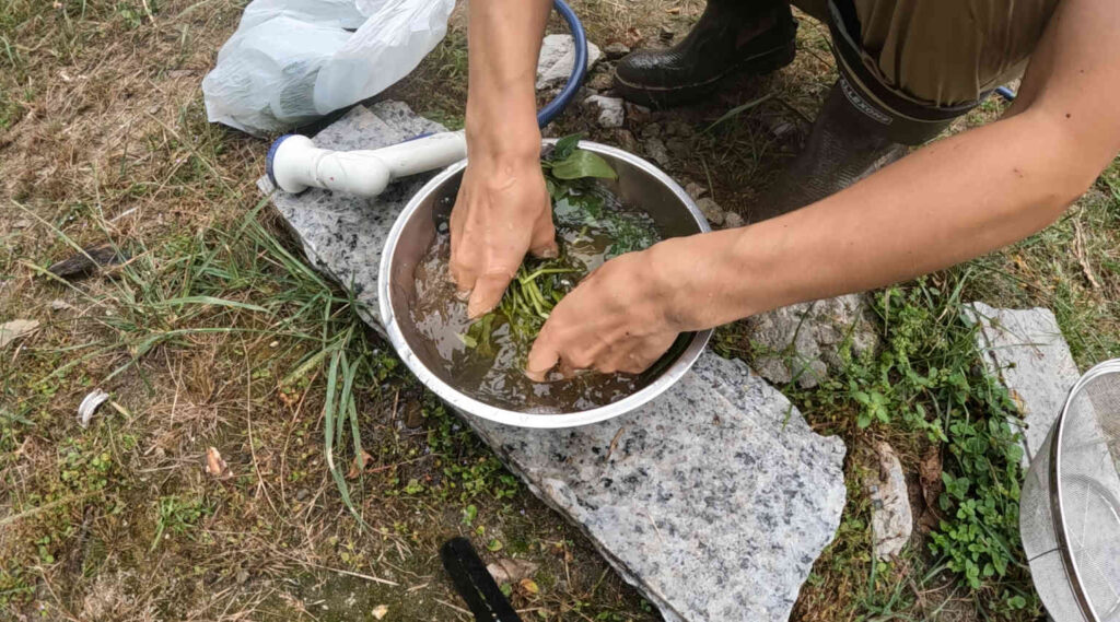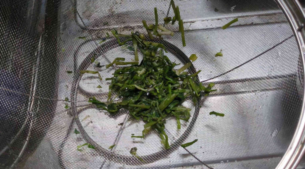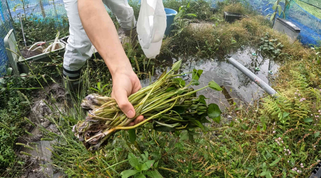 ちなみにこの池から採集したコナギはマジでめちゃくちゃ汚いので、屋外でコナギの葉が擦り切れるぐらい徹底的に下洗いをしています。