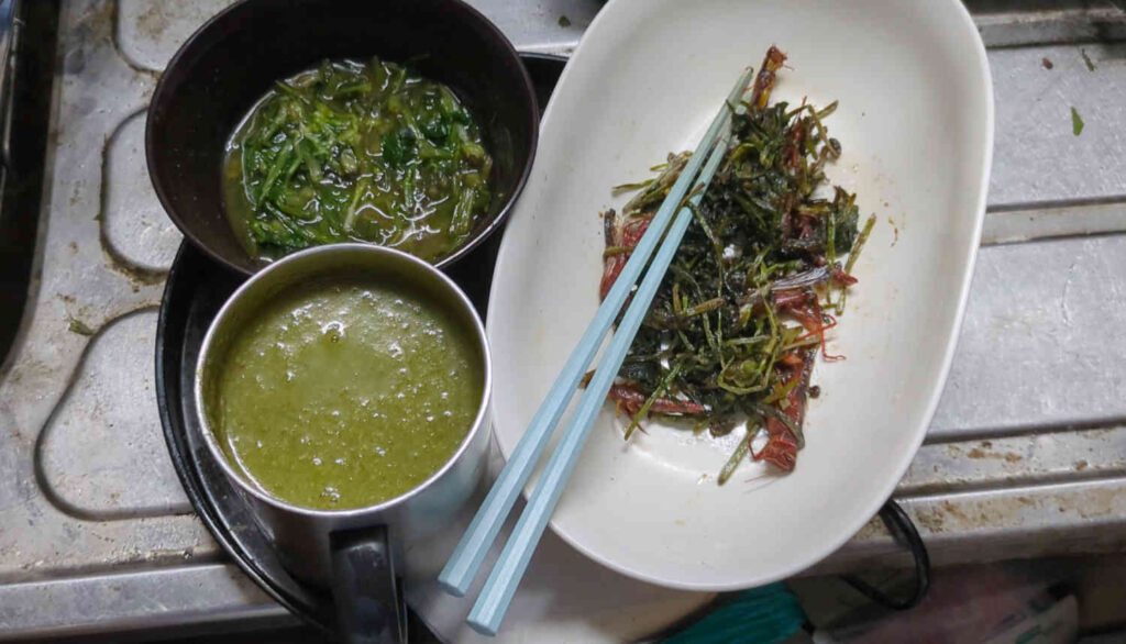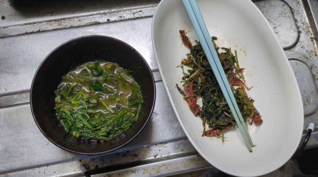 この日の献立は、コナギの味噌和えと、コナギとバッタのめんつゆ炒めと……
