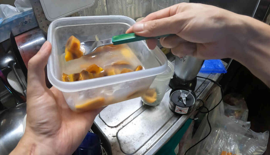 ミキサーの中にコナギと、本来だったらバナナ何かが適しているんですがもちろん無いため代わりに柿の甘露煮を投入。