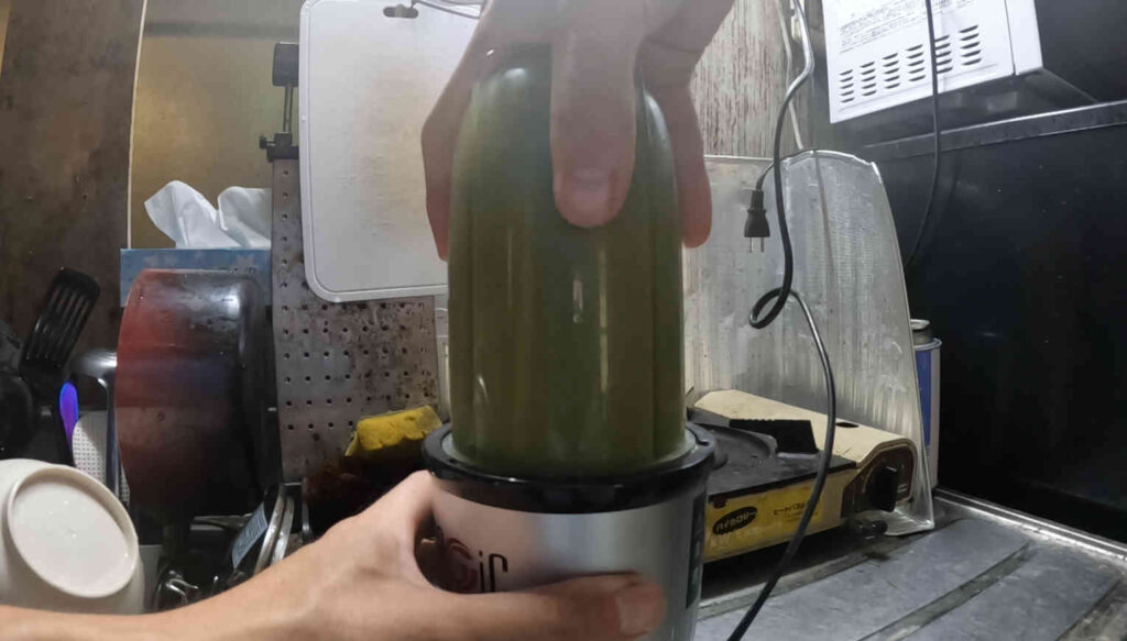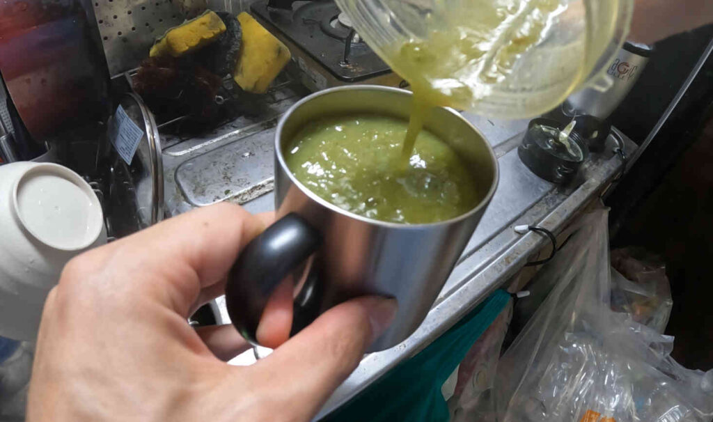 味は、投入した柿や砂糖のおかげか我慢できるレベルなのですが、ここまでドロドロにしてなおシャキシャキを主張するコナギの繊維がジュースとしては相当不快に感じてしまいます。