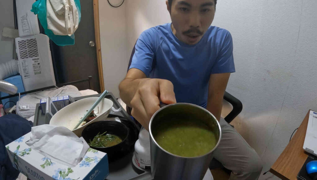 今回のコナギ尽くしで、コナギばっか食っていて気が狂いそうだったのですが、前回箸休めになってくれていた味噌汁までコナギに侵されているので、今回はまさかのバッタが僕の正気を保つ役目を担ってくれていました。