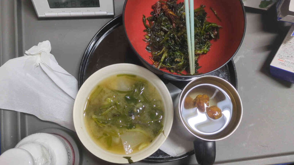 その後、塩ゆでやら何やかや前日同様調理して完成したのがこちら「コナギの味噌汁」「コナギとバッタの佃煮風」「梅シロップジュース」です。
