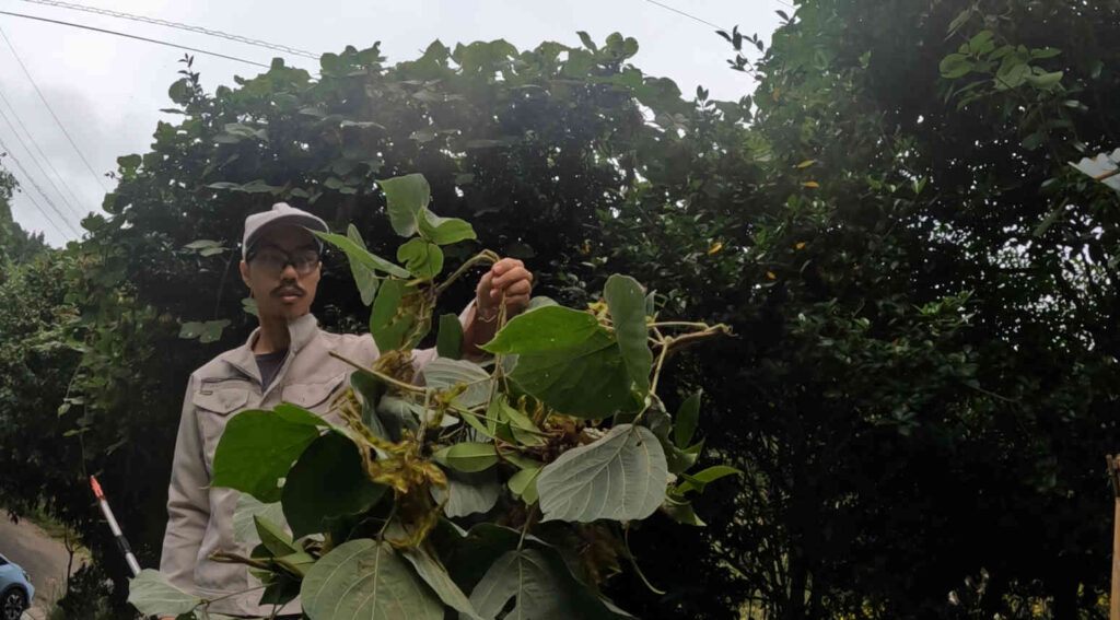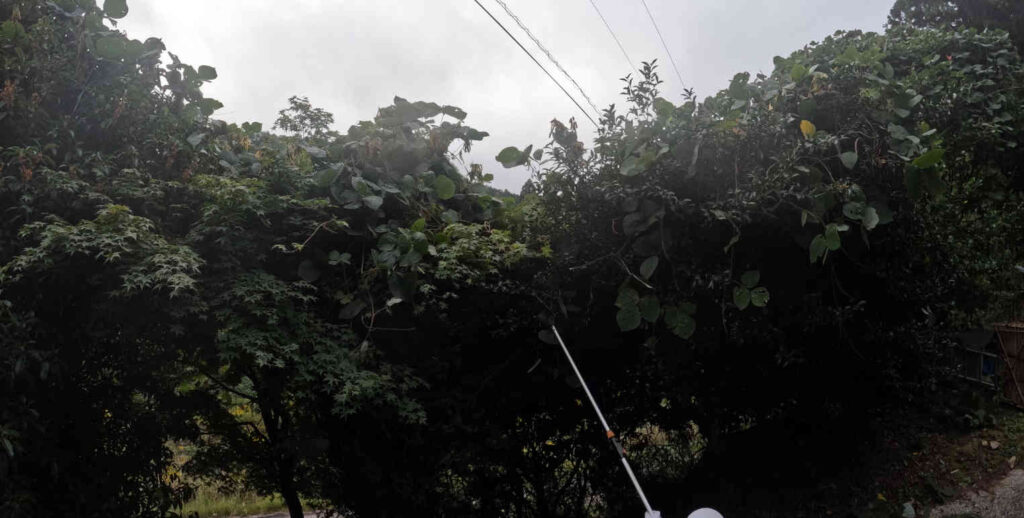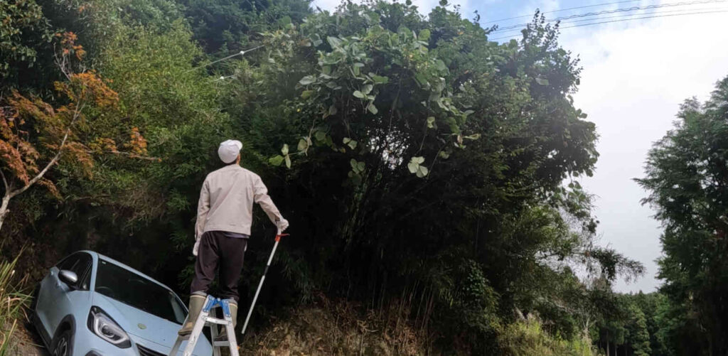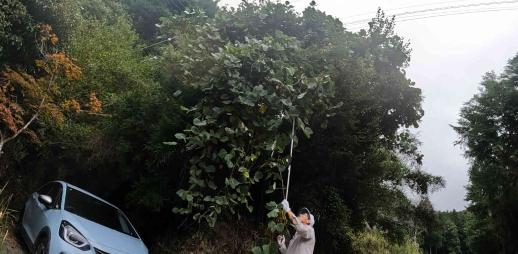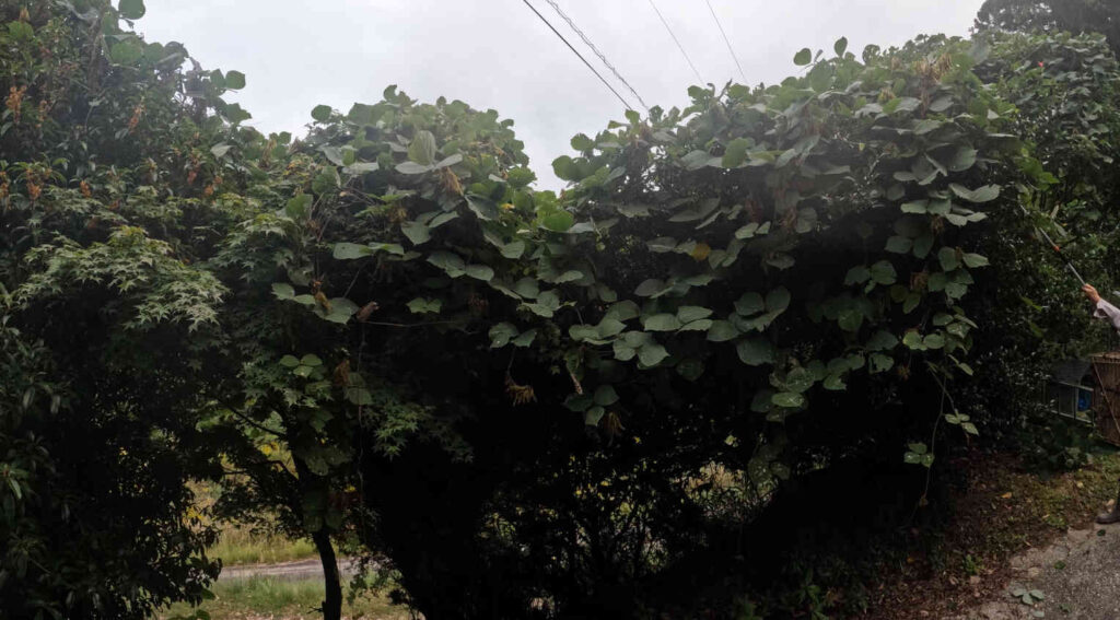 ここら辺のクズは、シカからの食害を逃れるためか木の上に纏わりつくようにして繁茂しているので、高枝切ばさみを使いつつつるを引っ張り、本体ごとさやを回収していきます。