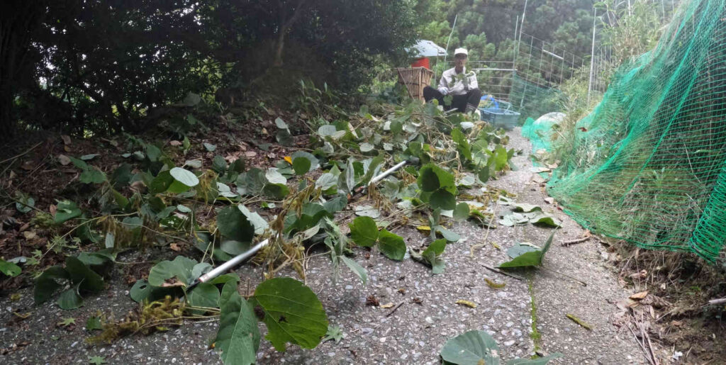 引っ張り落したクズのつるから、さやだけを切り取って回収していきます。
