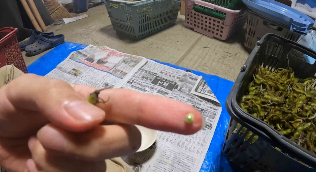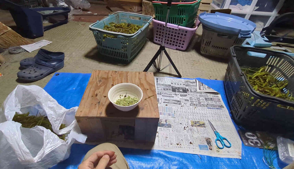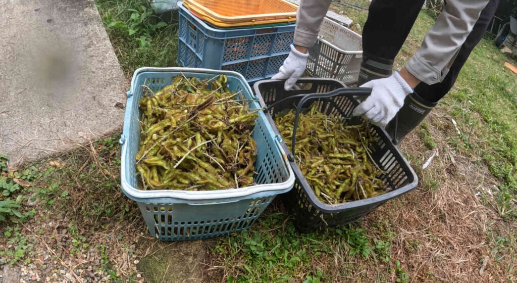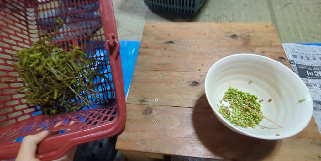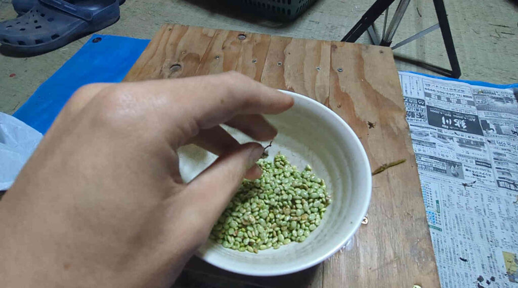 午前中、お昼ご飯を食べるまでの間ひたすら豆を取り続けて……