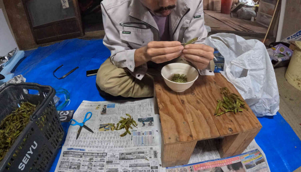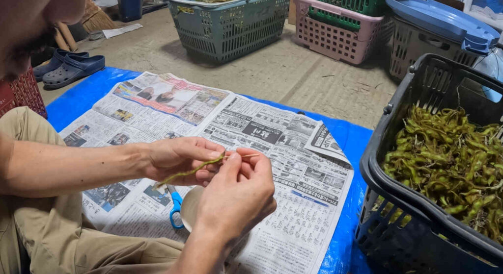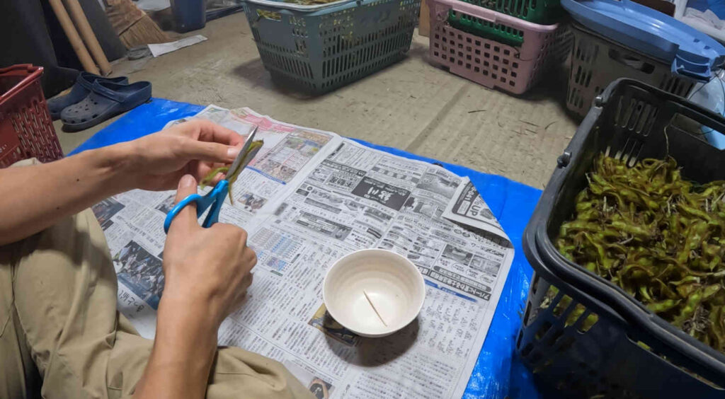 一息ついたら、葛豆を取り出していく作業に入りました。まずはさやの端をハサミで切って……
