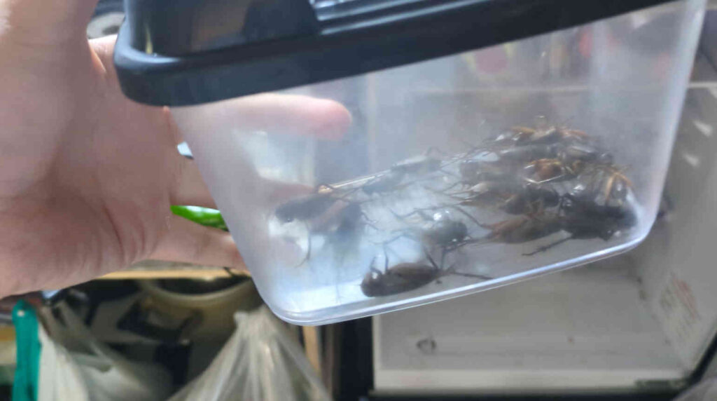 外が雨でバッタを捕まえに行けなかったので、少しずつ捕まえては冷蔵庫でストックしていたコオロギをこの日は食べることにしました。