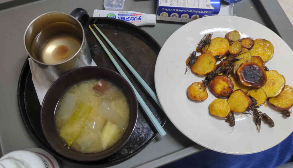 冬瓜・ナス・ピーマンの味噌汁と、サツマイモ・コオロギの大学芋風です。