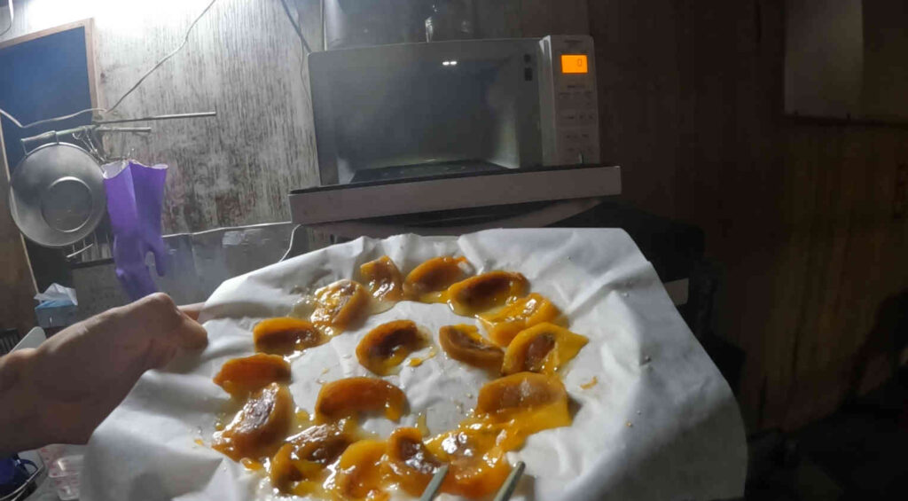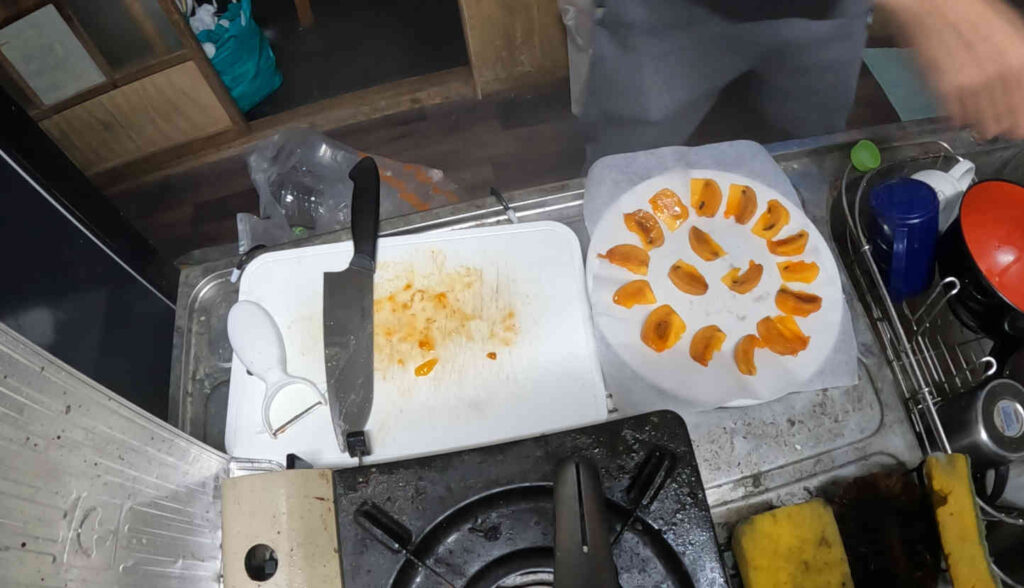 15日目の朝、とりあえず腹ごしらえに柿を食べていったのですが、「電子レンジで干し柿は作れる」という噂を耳にしまして……