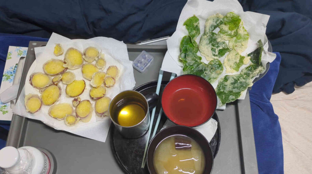 お昼はさっとサツマイモと葛の天ぷら、後残りの味噌汁でお腹を見たしました。