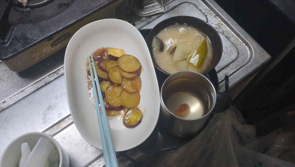 ちなみにこの日のお昼ごはんがこちら。サツマイモを上げた後にめんつゆ砂糖で煮るという大学芋もどきです。