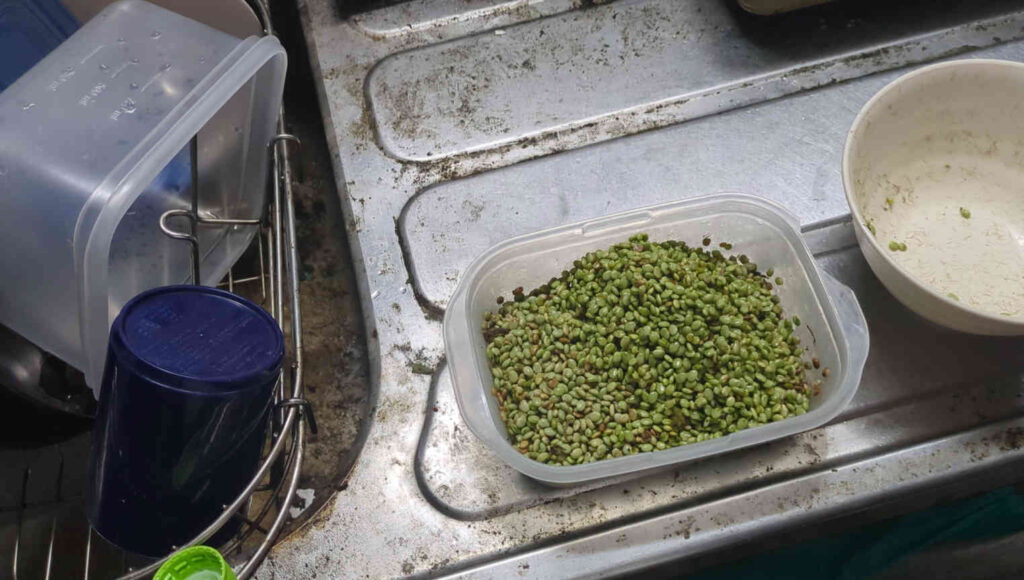 回収した豆を全てタッパーに詰めると、小さなタッパー3分の2ぐらいがようやく満たされる位集まりました。3日間平均6時間ぐらい作業しましたから、合計では18時間ぐらいかかってようやくこれですよ。マジで効率悪すぎますね。分かってましたけど。