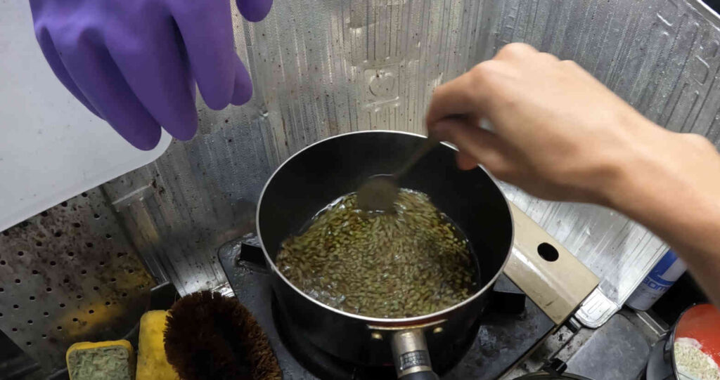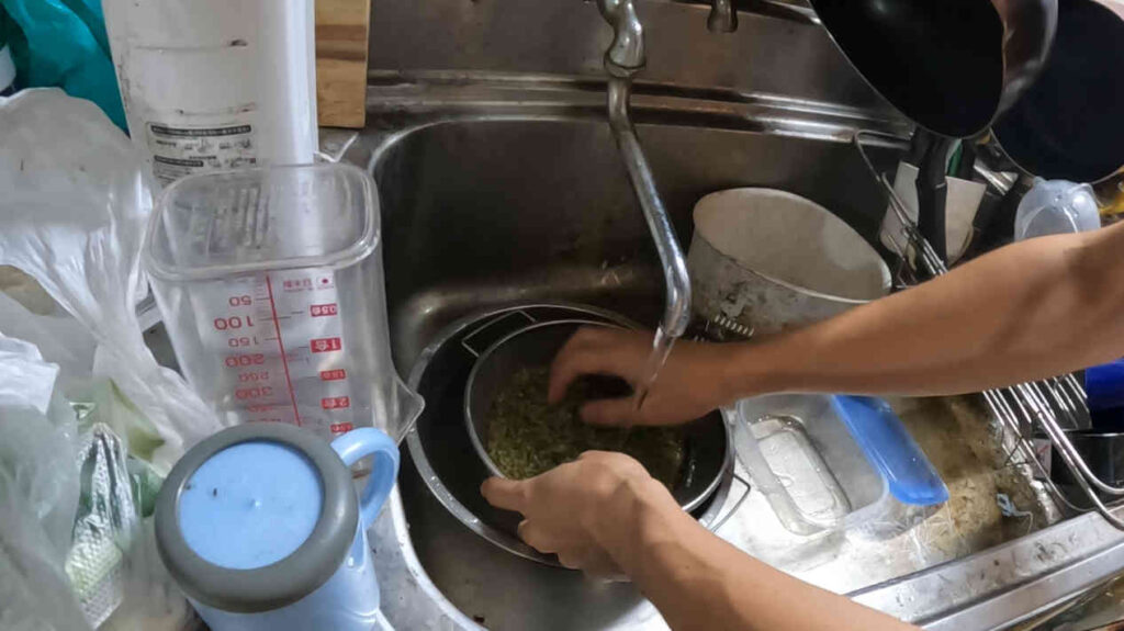 まずはクズ豆についている細かい汚れと、採集時に混入してしまったさやのゴミなどをザルで洗ってしっかり取り除いて行ったあと……
