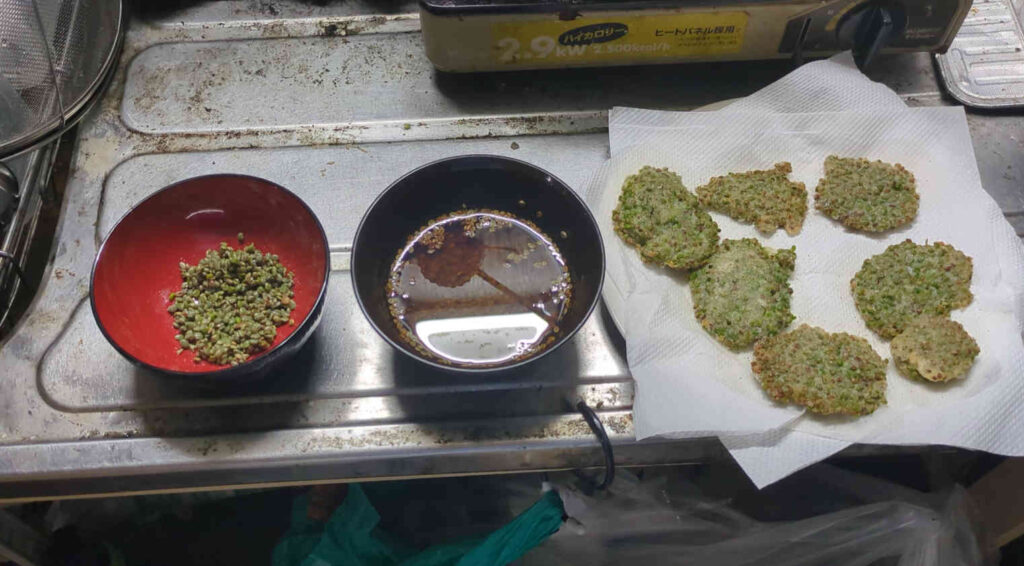 天ぷらとはいっても、クズ豆は一つ一つが非常に小さくまともに天ぷらにすることは無理なので、粘り気を強めにした天ぷら衣にクズ豆を混ぜて……