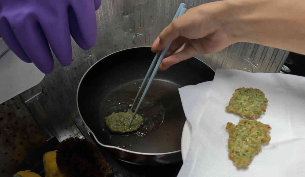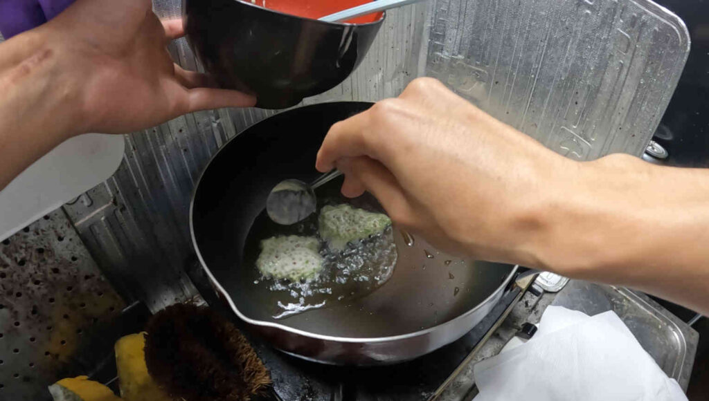 ハンバーグのごとく、油を敷いたフライパンの上で平らに広げて揚げていきました。