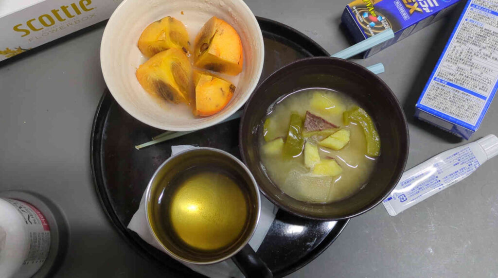 朝ご飯には、残り2つとなった柿の内一つを使ったレンチン柿と、サツマイモを具に使った作り置きの味噌汁、そして柿の葉茶と、温かいメニュー3品を食べて、寒い早朝を乗り切っていきました。
