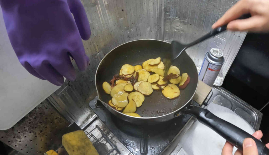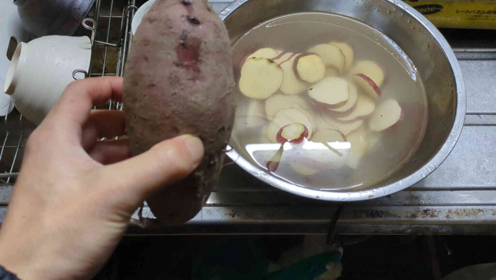 この日はまず、残り2つとなったサツマイモの内一つを丸々カットして水にさらしておきました。