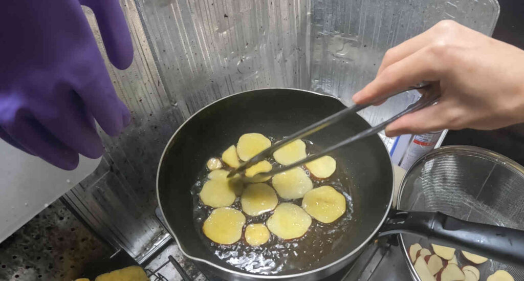 まずはたっぷりの油でサツマイモとバッタを揚げまして……