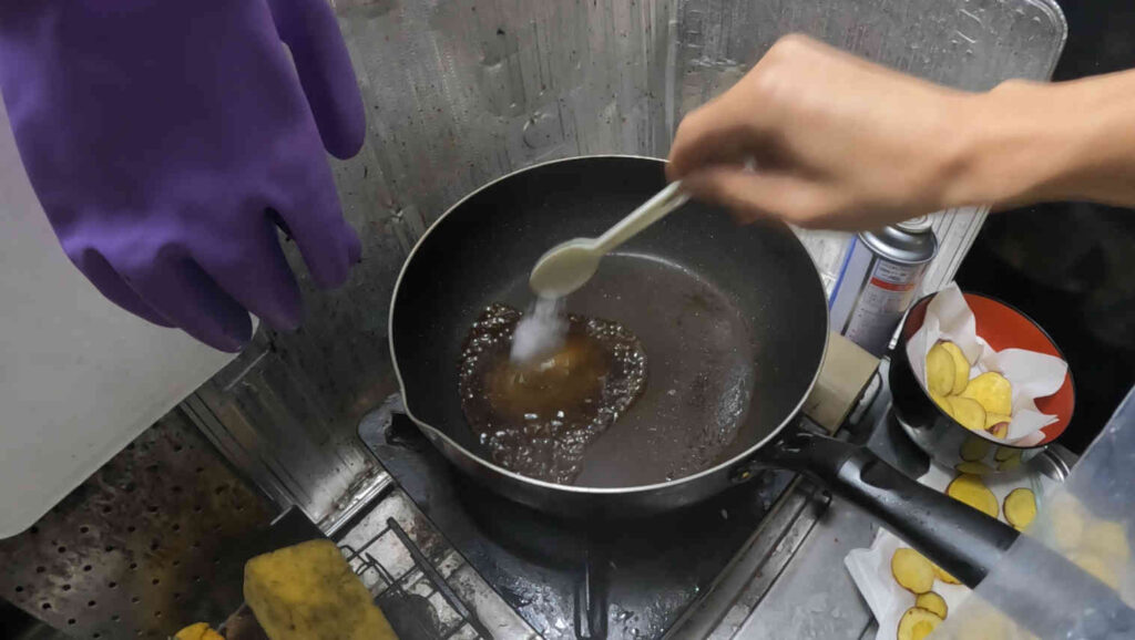 一旦引き上げて油を切った後、めんつゆと砂糖を温めてタレを作ります。