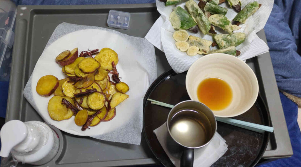 と言う訳でこの日のお昼ごはん、バッタとサツマイモの大学芋風と、アケビの皮のクズの葉包み天、天つゆ、ウメシロップジュースです。