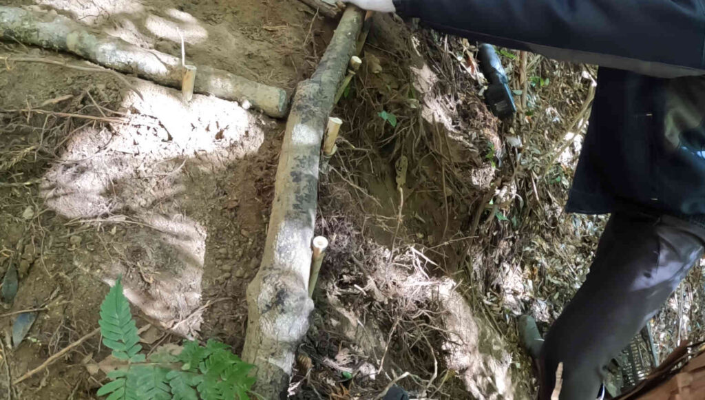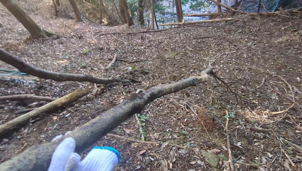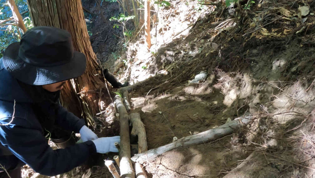 斜面に丸太を置き、ずり落ちないよう下を竹杭2本で支えます。