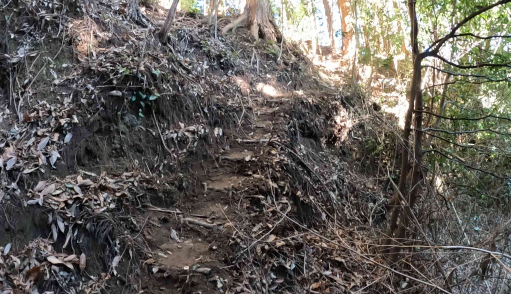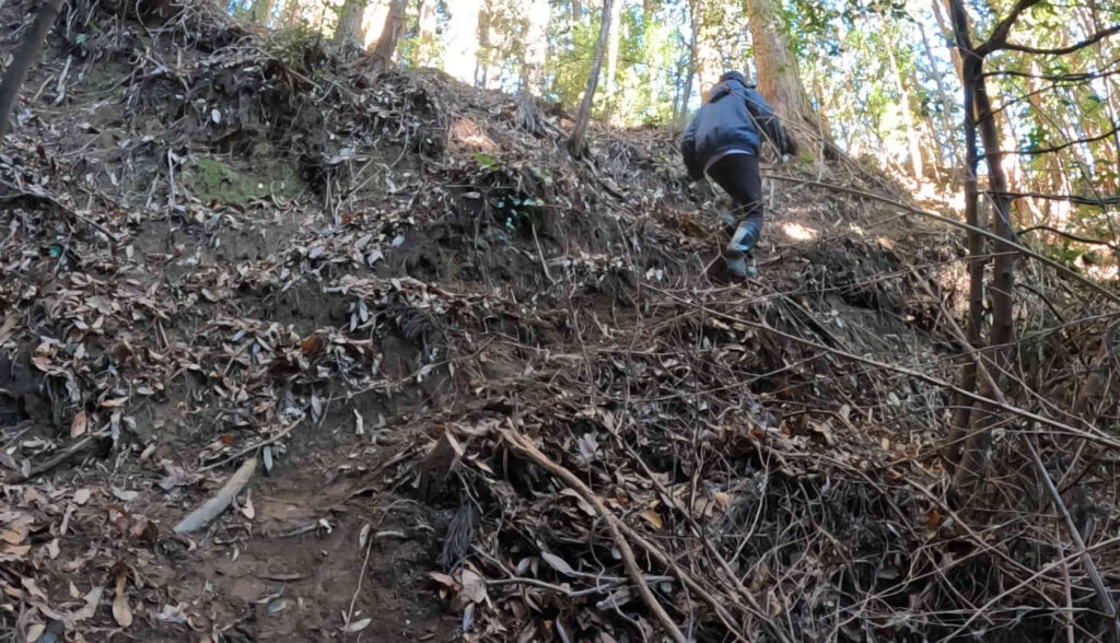 拡張整備したことによって、通ること自体は可能になりましたが、今のままだと地面が土むき出しの上、かなり急斜面になっている場所も多いため手をつかずに登るのはかなり困難な状態となってしまっています。