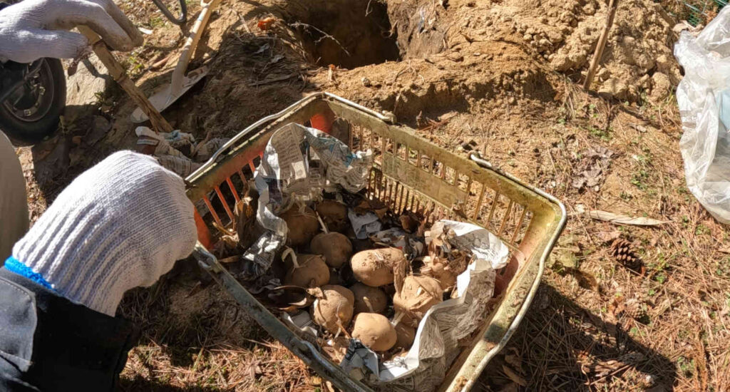 地面に埋めていたジャガイモを取り出して畑に植える ①ジャガイモ取り出し、畑準備