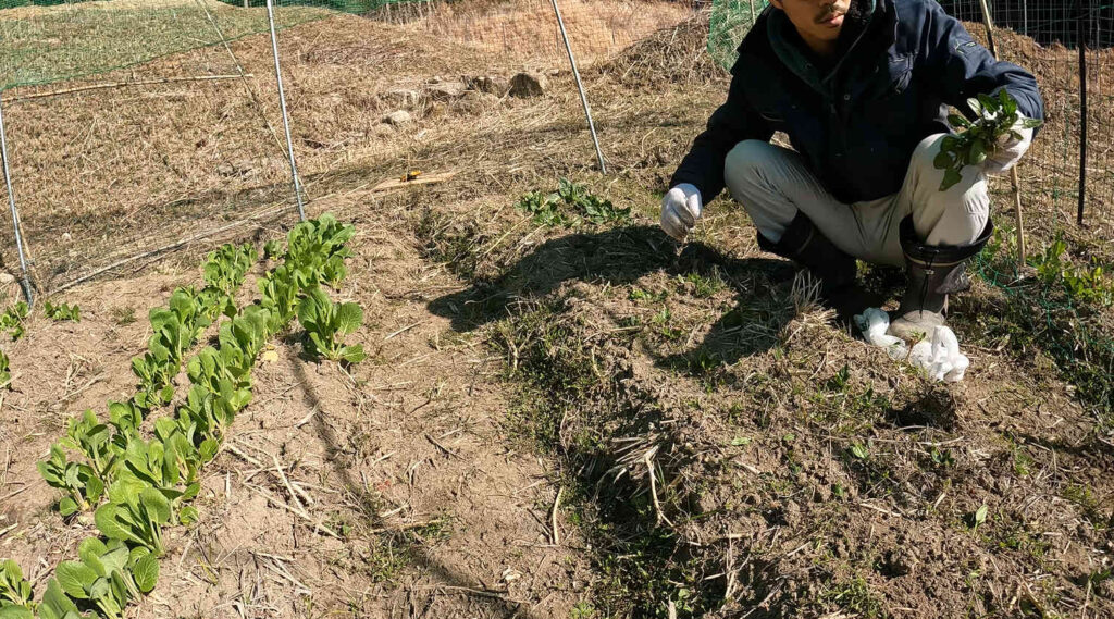 次にジャガイモを植える畑の準備ですが、実はまだその予定地に去年の冬に植えたホウレンソウとコマツナ、そしてチンゲンサイが生えてしまっています。