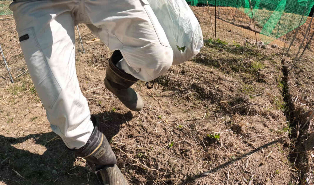 それぞれの畝の上に必要分の肥料を投入し……
