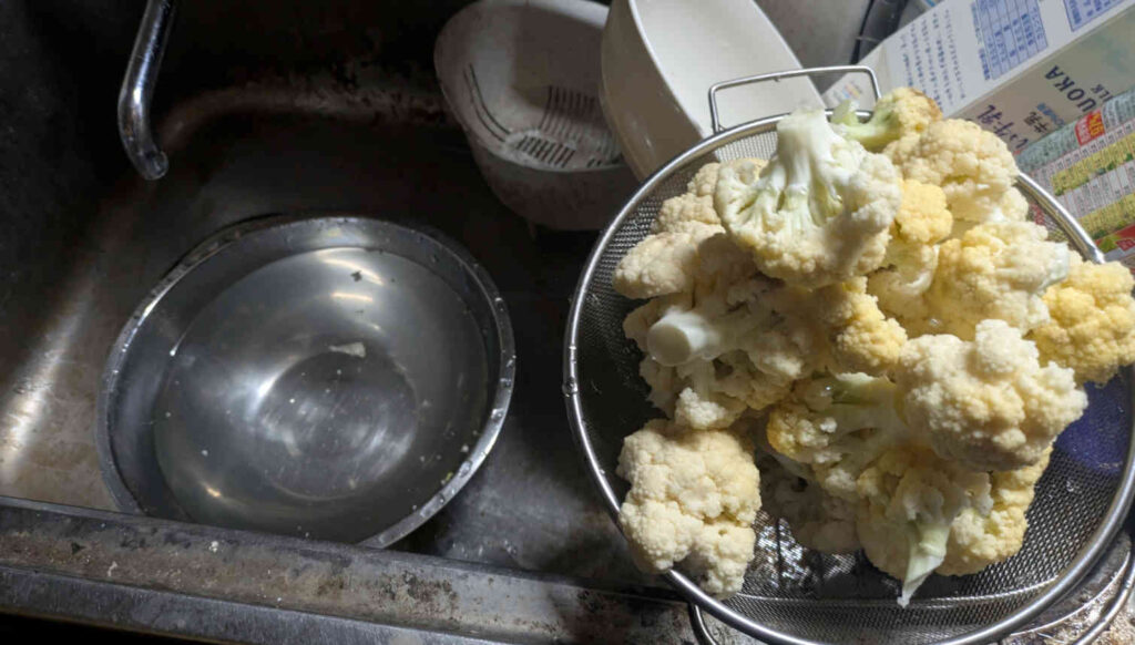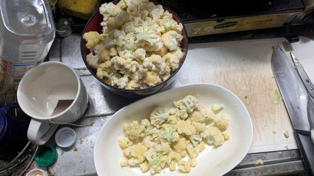 なのでまずは、カリフラワーを解体してモコモコ部分だけを取り出していきました。