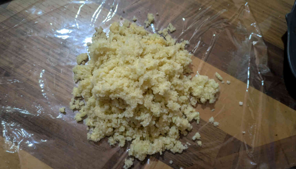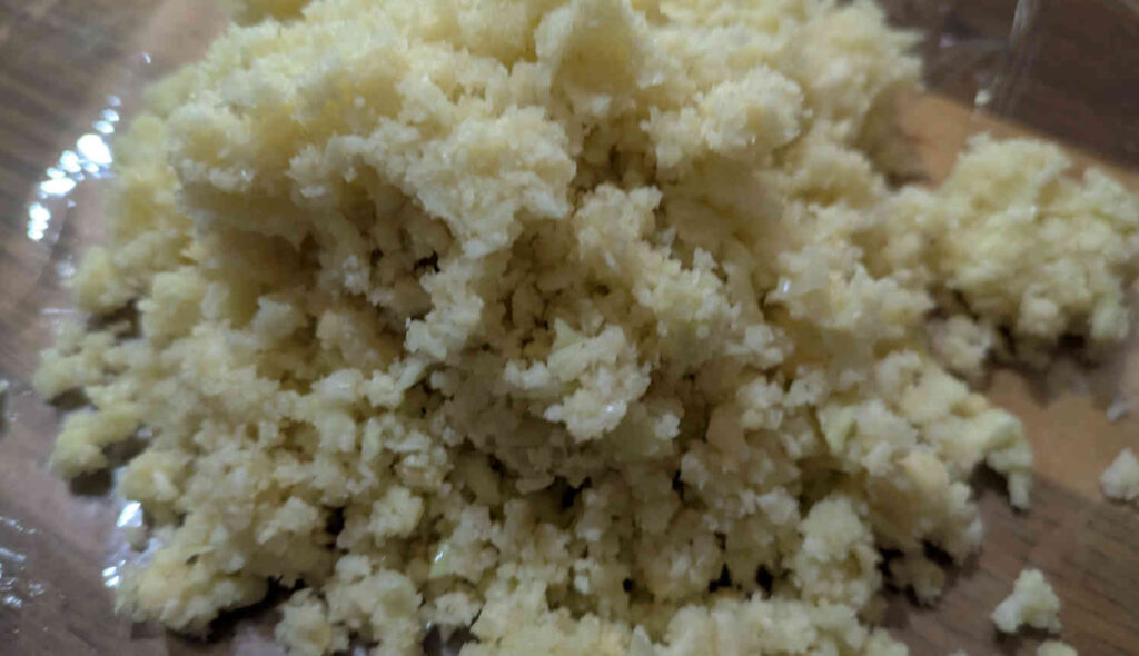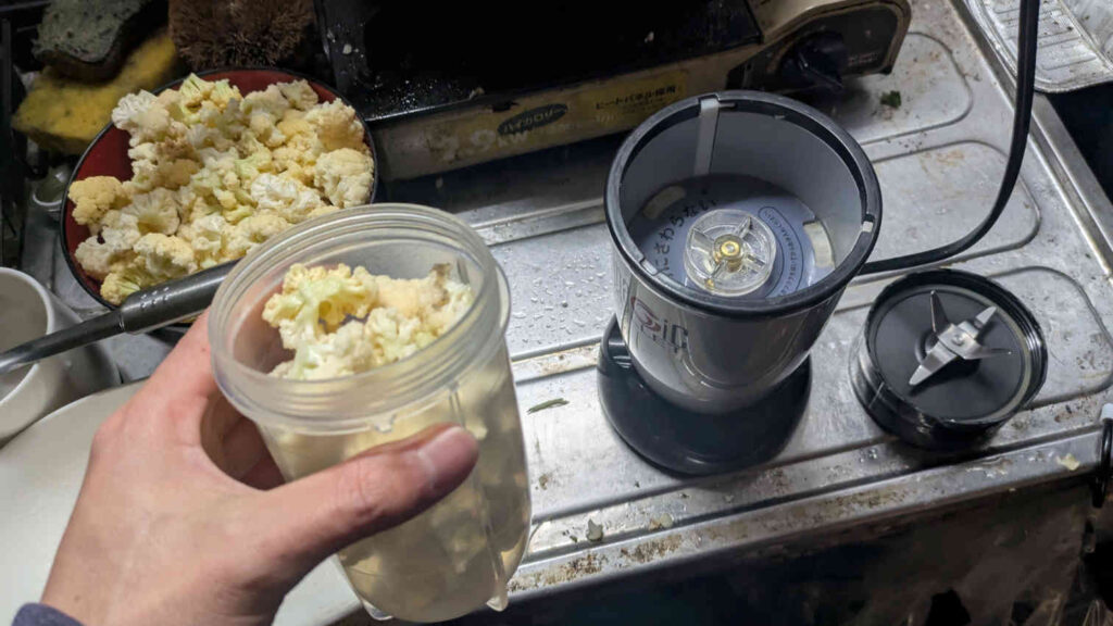 カリフラワーを粉々にする行程は、何も機会が無い場合は地道に包丁で刻むとかになるみたいですが、わが家にはコオロギの餌作りに使っていたフードプロセッサーがありますのでそちらを利用して粉砕していきました。