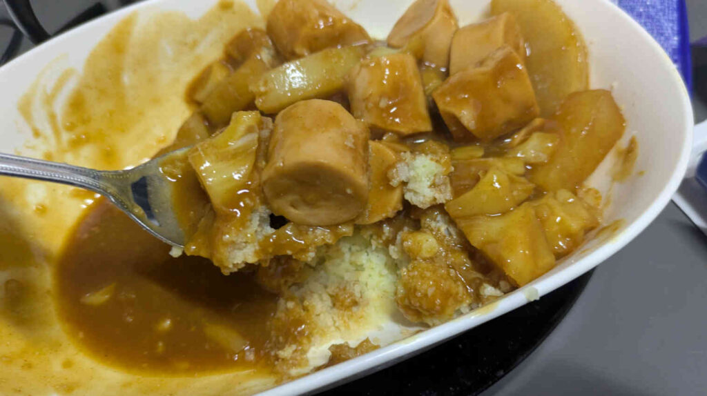 ただ食感がボソボソしていて、水分量が少ないのが米と比較した時に目立つので、今回食べたカレーライスのように「何かしらの汁が乗った丼もの(中華丼とか)」と言う形としてならば特に違和感なく食べられると思いましたが、単体で食べるのはちょっと厳しいような気がしました。