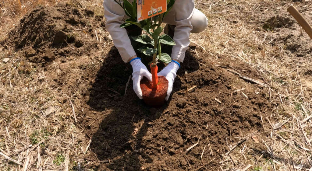どうやらミカンの苗木を植える際には、根っこがより広く成長するよう環境づくりをすることが大事らしいです。