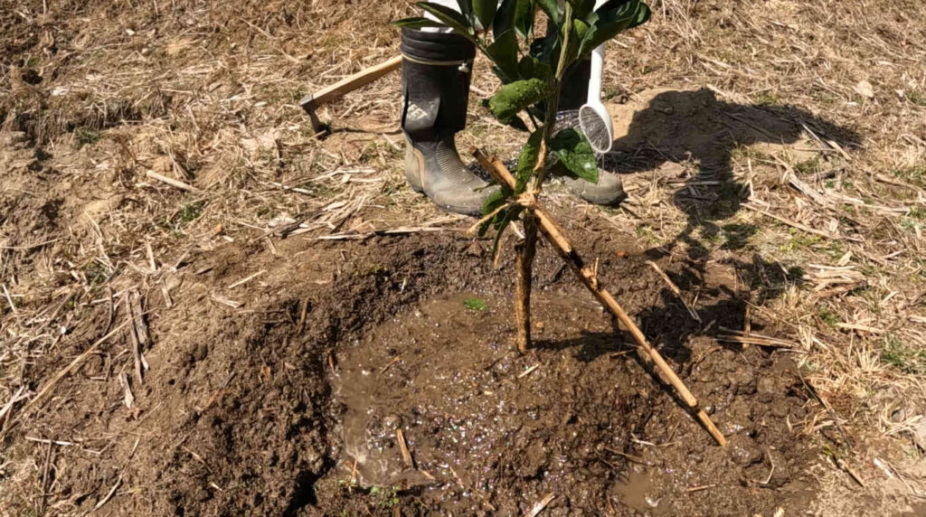 たっぷり水を挙げて、土と根がしっかり結びつくようにしたら植樹は完了です。