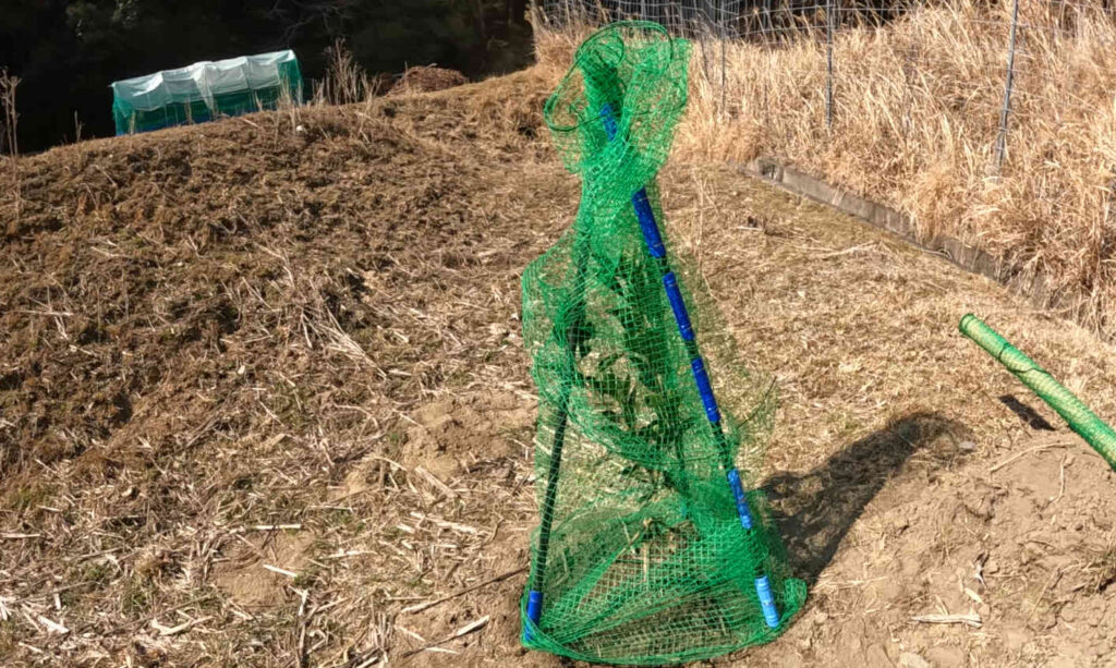 その周りをネットで囲み、パウチで固定して防獣処理は完了です。