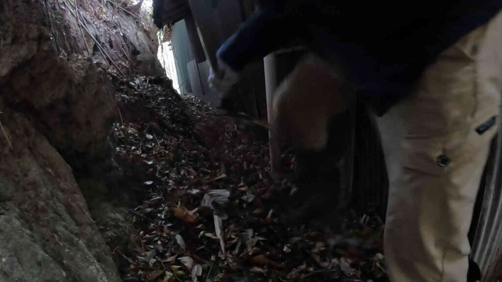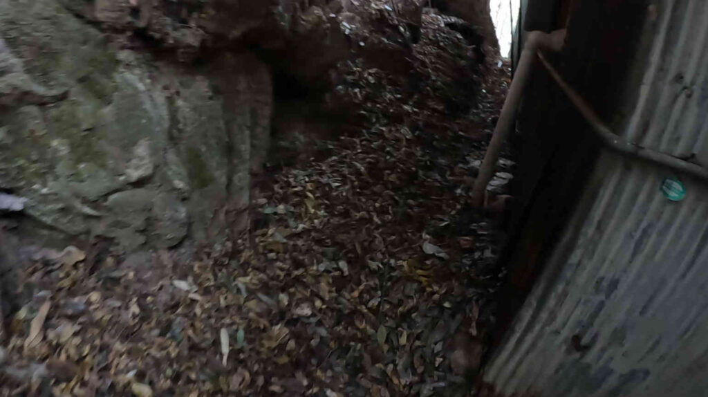 空き家のすぐ裏手は切り立った山肌となっており、そのわずかな空間には山から降り注ぎ、空き家の屋根を伝って降り積もった落ち葉が大量に積み重なっています。