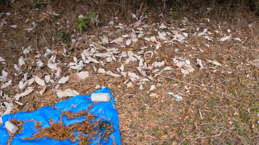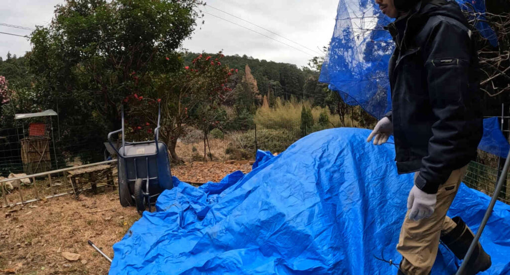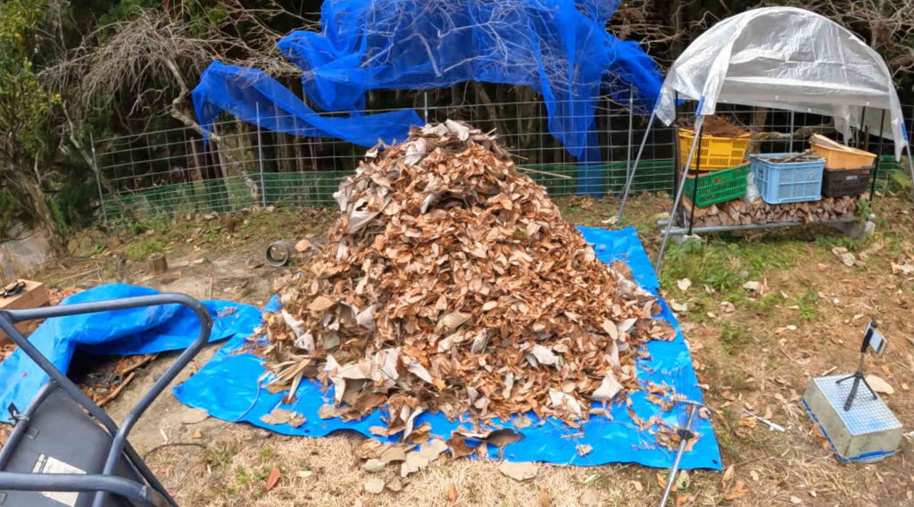 流石にこの日はもう炭作りするような時間も体力も無かったので、夜に雨が降ったり霜が降りて落ち葉が湿気ってしまわないようビニールシートで覆っておきました。
