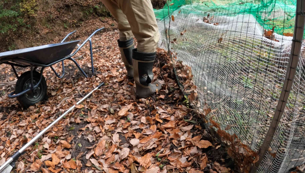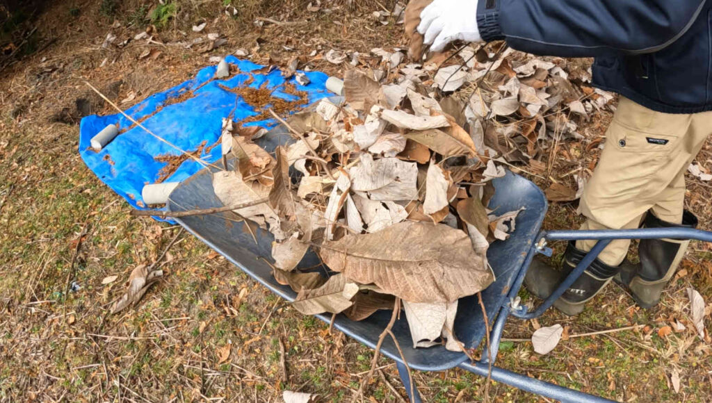 そこで今回は庭以外からも土地の中でも特に落ち葉がたくさん落ちている所から更に落ち葉を集めていき、その他木炭づくりのための準備を進めていく様子をお伝えしていきます。