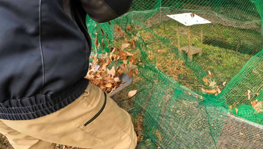 最後に、カエル牧場のフェンスやネットに引っかかるようにして降り積もった落ち葉を回収していきました。