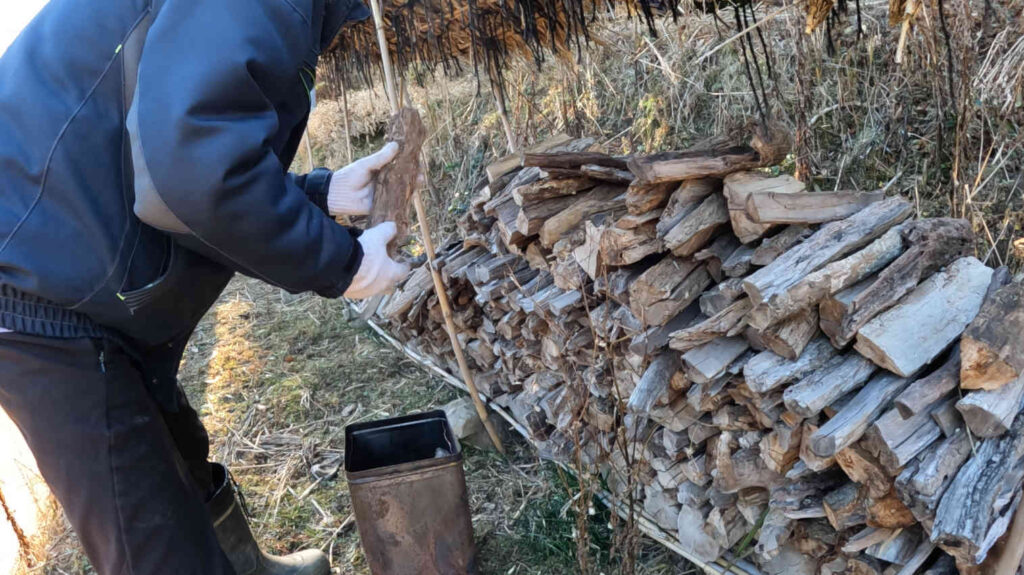 選出する薪は、薪の中でもできるだけ中身が詰まっていて重みのある種類の木を探していきます。