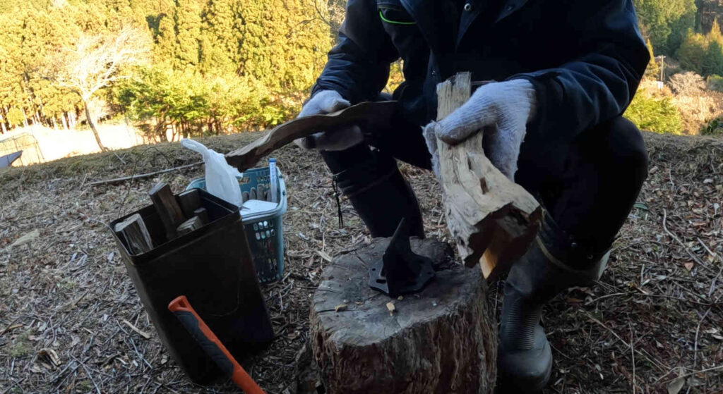 できるだけ細かく割っておいた方が木炭になるまでの時間が短縮できるのではないかと思い、既に割ってある薪を更に細かく割っていきました。