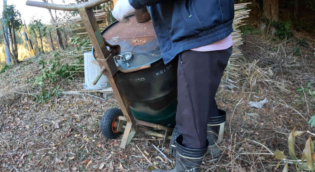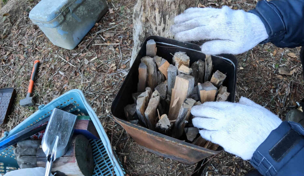木炭にする薪を選出し、一斗缶に詰めていきます。