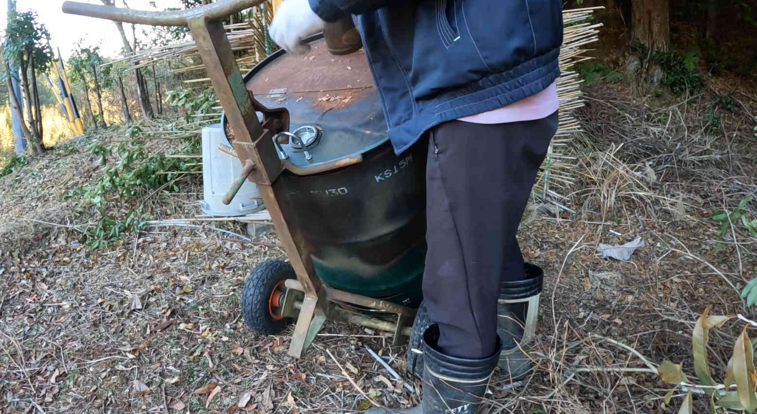 ドラム缶自体は中身が空ならそこまで重くは無いのですが、この焼却炉は二重底にするために鉄の棒がぶっ刺さっていたり、煙突が付いていたりして凄い持ち運びがしづらいんですよね。