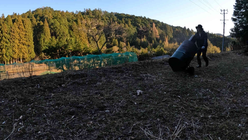 そこで丁度空き家の残置物として転がっていたこちらのドラム缶台車を使って、農地から庭に焼却炉を移動させていきました。