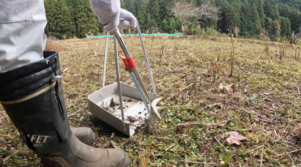 まずはとにかく農地に転がっているシカ糞を塵取りと熊手で掻き集めていきました。