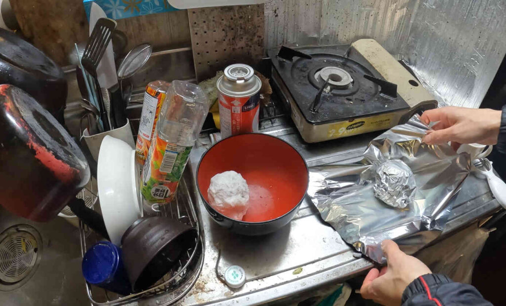 しっかり水に浸した後、更にアルミホイルも2重にします。