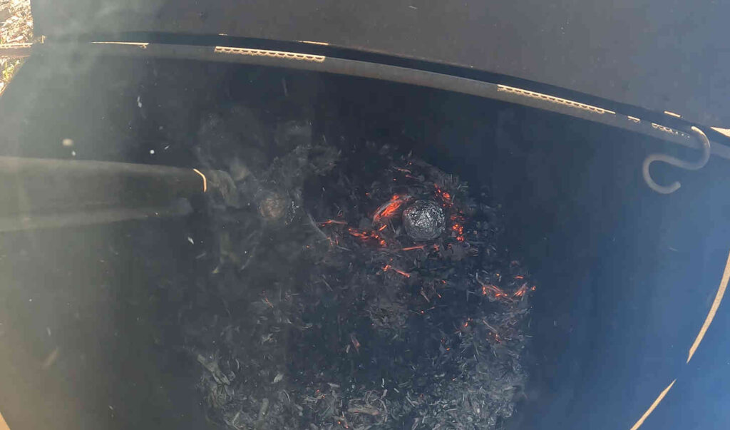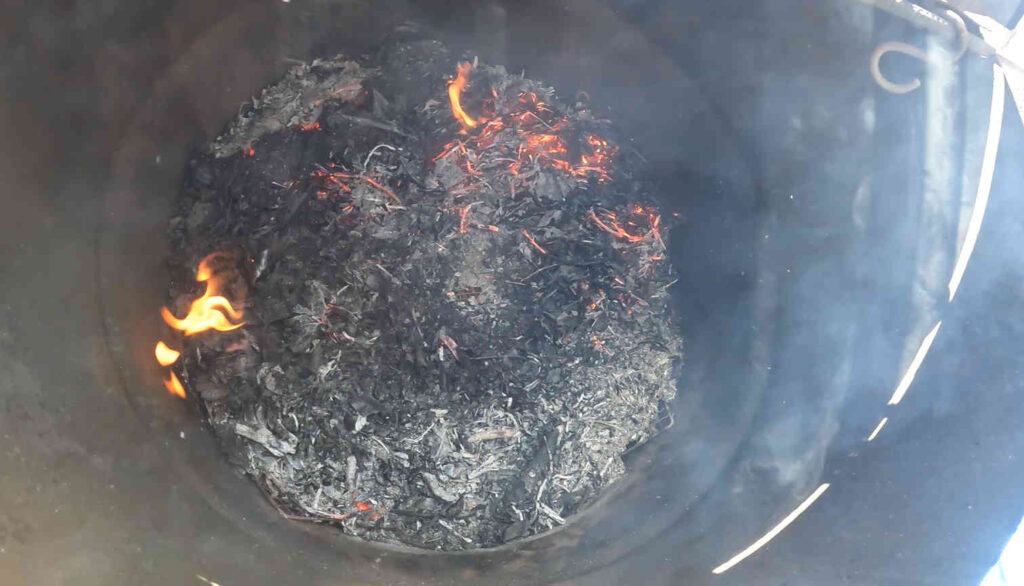 その上から被せるように落ち葉を追加で投入し、火力を挙げるとともに火が通りきるまで熱が維持できるようにします。