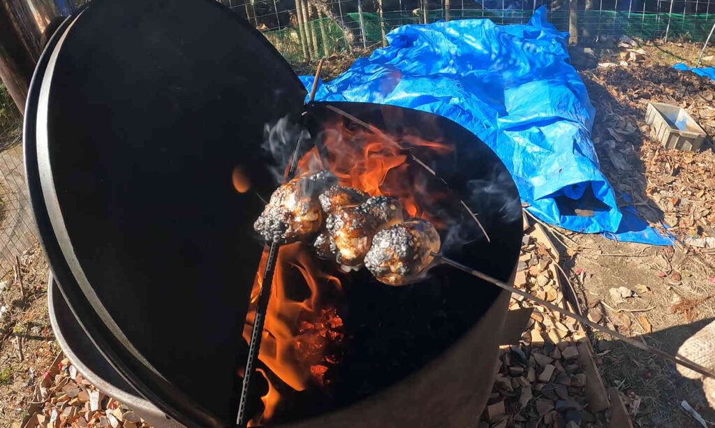 勢いよく燃えだしたらすかさず鐵串に刺したウィンナーを火に当てて焼きます。